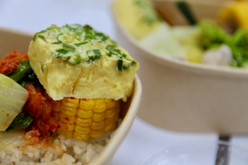 當天的配菜是芥蘭花、大白菜、玉米、日式白蘿蔔、地瓜、蔥玉子燒、櫛瓜
